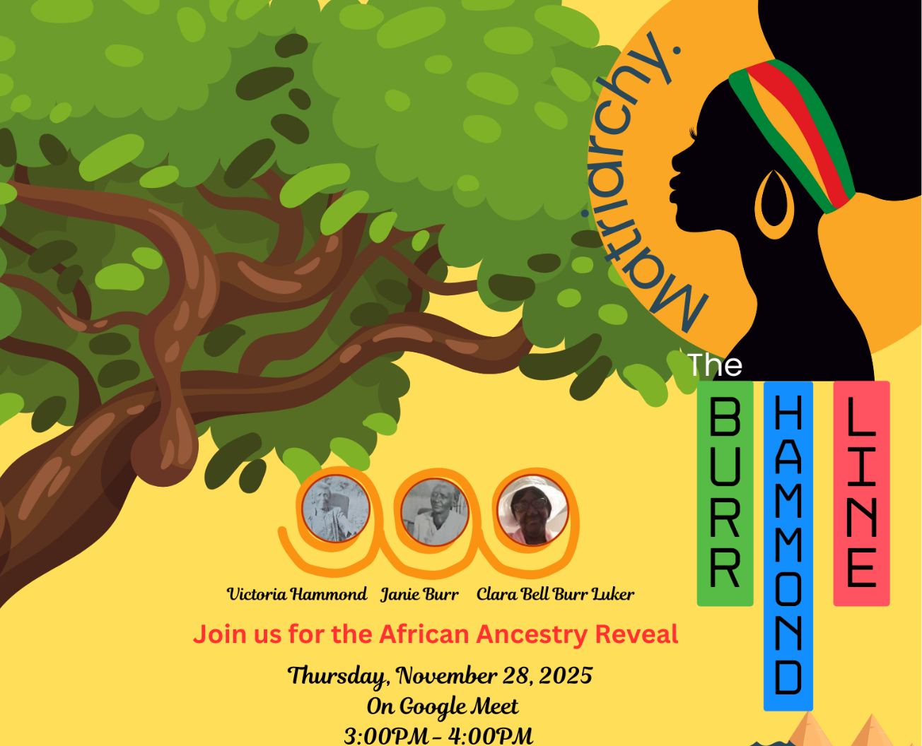 Mark your calendars! On Thanksgiving Day, Thursday, November 28, 2024, join us via Google Meet for the highly anticipated reveal of the African tribe from which our family descends. This momentous event will connect us to our ancestral origins and inspire future generations.